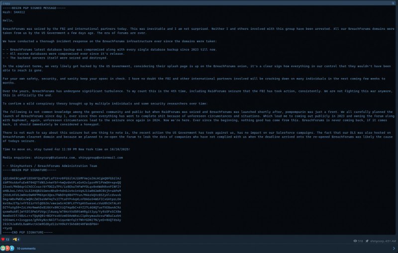 Злоумышленники опубликовали в Telegram сообщение, подписанное PGP-ключом ShinyHunters (журналисты Bleeping Computer подтверждают его подлинность), в котором заявили, что конфискация домена была неизбежна и пишут, что «эра форумов закончилась». По их словам, все серверы бэкенда BreachForums изъяты властями.