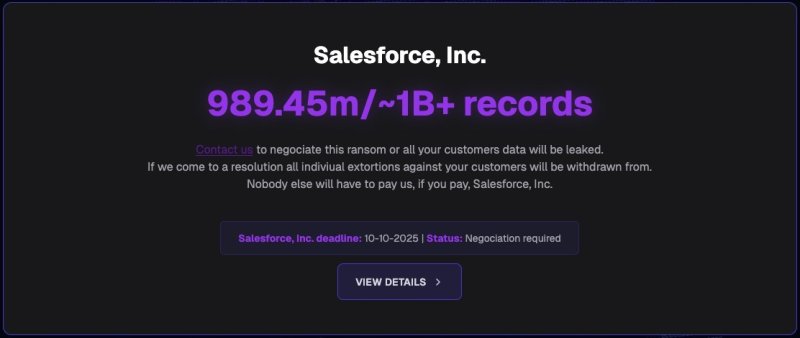 Также хакеры разместили на сайте отдельную запись, адресованную компании Salesforce. Вымогатели потребовали у компании выкуп за предотвращение «слива» всех данных пострадавших клиентов (суммарно около 1 млрд записей, содержащих персональную информацию).
