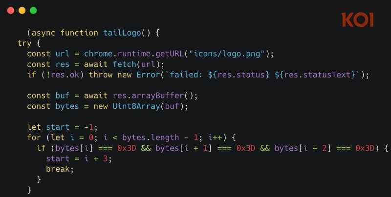 Как объясняют исследователи, вредоносный код скрывался в PNG-файлах логотипов расширений. Специальный скрипт парсил необработанные байты изображения, извлекал спрятанный там jаvascript-фрагмент и запускал его. Этот фрагмент выступал загрузчиком, который через 48 часов после установки обращался к удаленному серверу за основным пейлоадом.