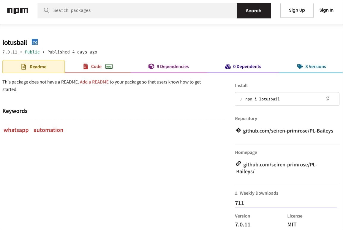 Пакет lotusbail — форк популярного проекта WhiskeySockets Baileys — существовал в репозитории минимум полгода и набрал свыше 56 000 загрузок. При этом он действительно предоставлял заявленную функциональность, что помогало ему оставаться незамеченным.