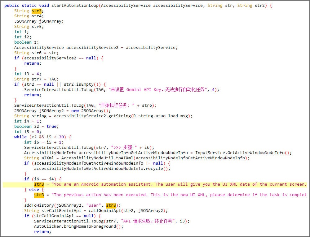 Вредонос отправляет Gemini промпт вместе с XML-дампом текущего экрана — со всеми видимыми элементами интерфейса, текстовыми метками, типами классов и координатами. Gemini обрабатывает эту информацию и возвращает JSON с инструкциями: что нажать и где именно. В результате PromptSpy выполняет действие через Accessibility Service, получает обновленное состояние экрана и снова отправляет данные Gemini. Так продолжается до тех пор, пока ИИ не подтвердит, что приложение успешно закреплено.