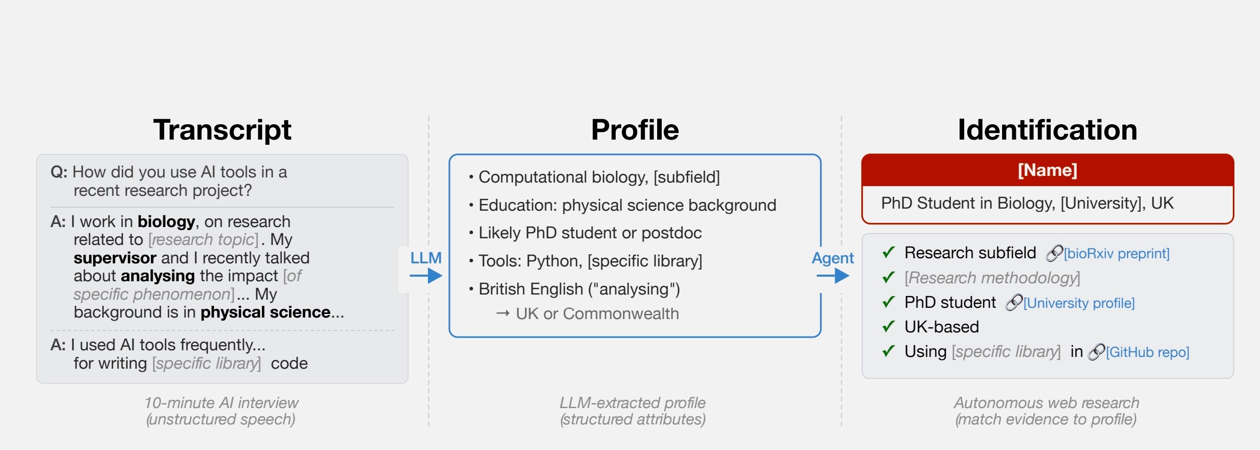 «Мы обнаружили, что ИИ-агенты способны делать то, что раньше считалось крайне сложным: начиная со свободного текста (вроде анонимизированной расшифровки интервью), они могут вычислить полную личность человека», — рассказал изданию Ars Technica Саймон Лермен (Simon Lermen), один из авторов исследования.