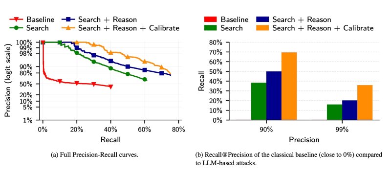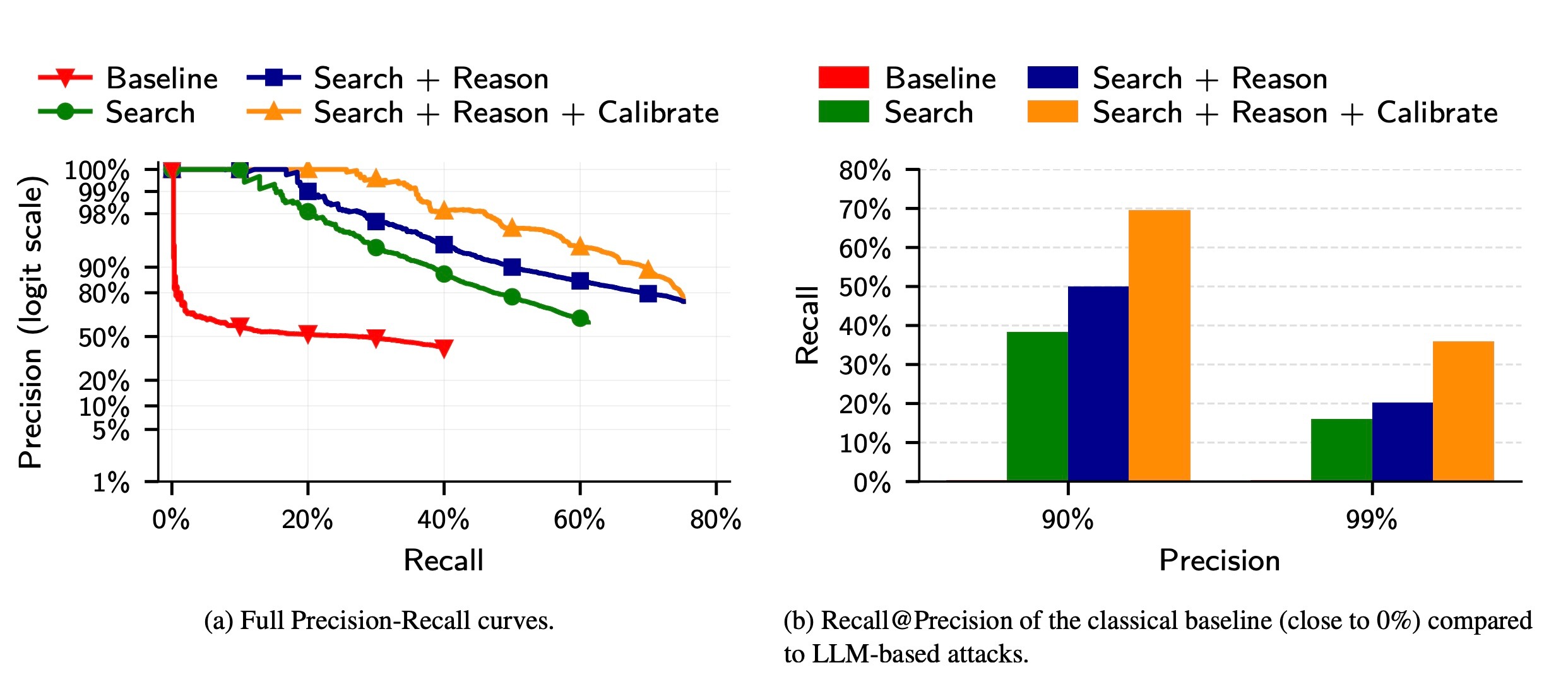 В третьем эксперименте авторы исследования сравнили работу LLM с классической атакой Netflix Prize, использовав набор данных из 5000 пользователей Reddit (плюс 5000 ложных профилей для отвлечения). Языковая модель значительно превзошла классический метод: точность традиционных атак падала быстро, тогда как LLM-подход показал большую надежность.