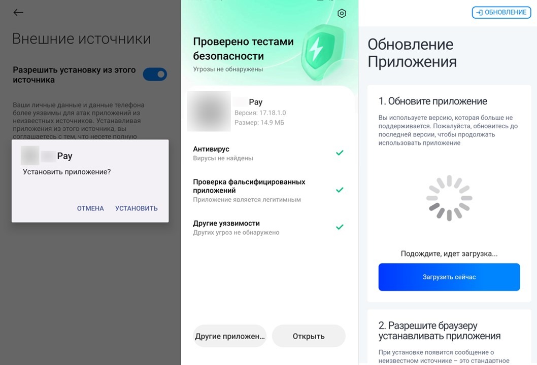 Falcon использует двухэтапную схему заражения. Сначала жертву с помощью социальной инженерии убеждают скачать APK-файл с фишингового сайта, замаскированного под банковский ресурс, госсервис или мессенджер. После установки приложение-дроппер предлагает «обновиться» — и под видом обновления на устройство проникает FalconRAT.