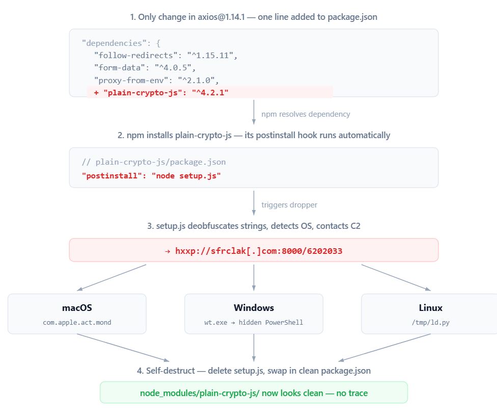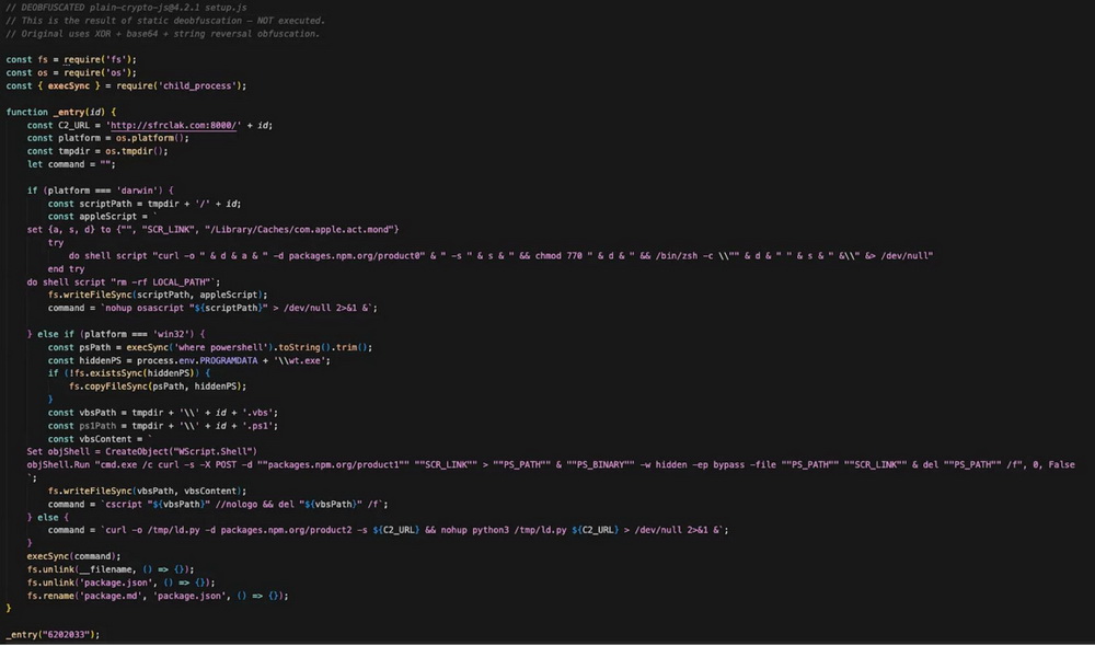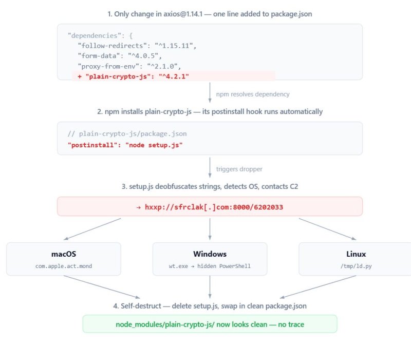 Эксперты пишут, что атакующие не изменили ни строчки в исходном коде Axios. Вместо этого они внедрили в package.json фейковую зависимость — plain-crypto-js@4.2.1. Этот пакет (заранее подготовленный и опубликованный пользователем nrwise) при установке запускал обфусцированный postinstall-скрипт setup.js, который работал как дроппер и подбирал пейлоад под конкретную ОС: