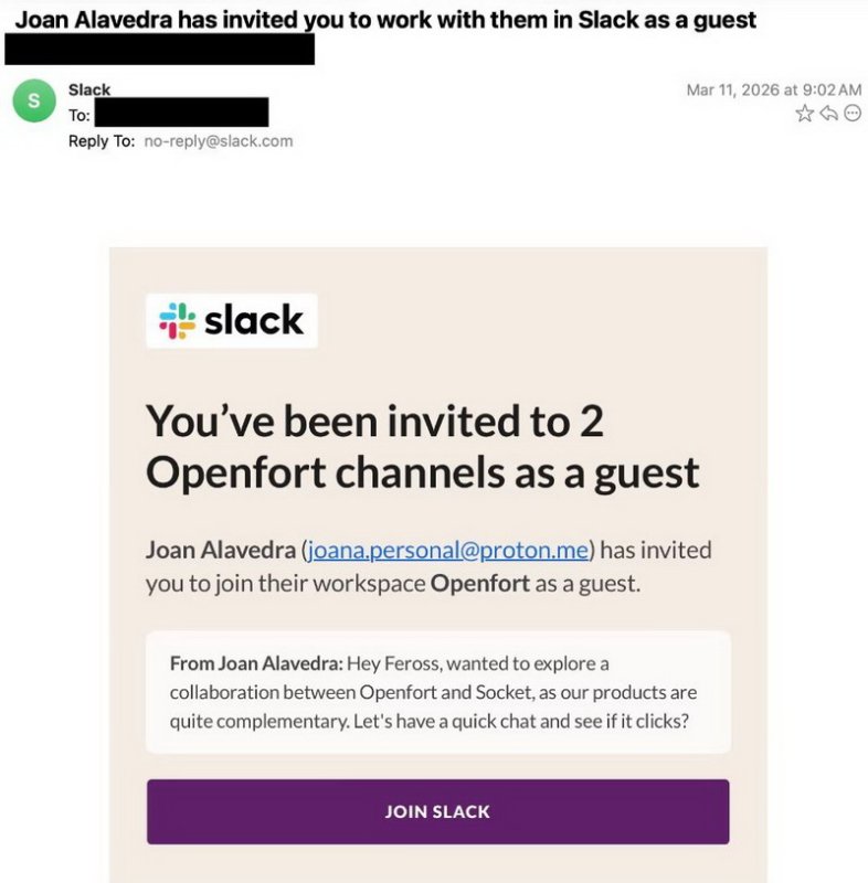 Аналогичную историю описывает Жан Бурелье (Jean Burellier), контрибьютор Node.js core и Express: ему написали в LinkedIn от имени компании Openfort, после чего пригласили в два Slack-воркспейса и на фейковый созвон в Teams с предложением обновить Teams SDK.