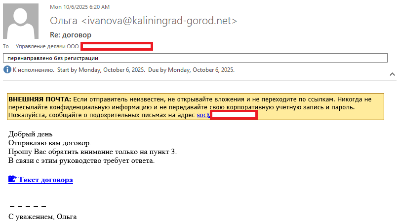 Цепочка заражения выглядит следующим образом: жертва получает фишинговое письмо со ссылкой, замаскированной под путь к официальному документу (например, «Текст Договора»). Если кликнуть по такой ссылке, скачивается TAR-архив с VBE-скриптом, который запускает трехступенчатое заражение.