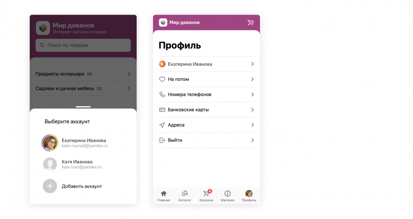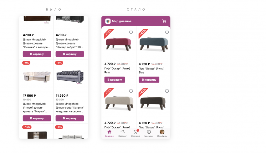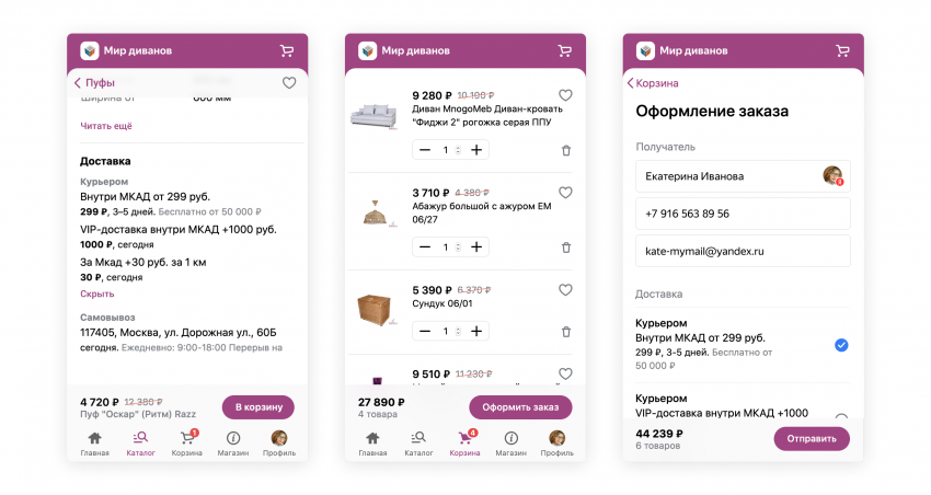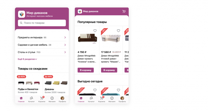 Единая панель позволяет удобно перемещаться по магазину — как в привычных приложениях. Например, в один клик перейти из карточки товара или каталога в корзину.