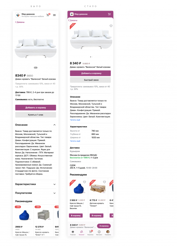 Корзину и остальные кнопки на пути к покупке мы постарались разместить так, чтобы пользователь из любой части экрана мог легко перейти в корзину и оформить заказ. Например, если пользователь спустился к характеристикам и решил купить, листать вверх не нужно — кнопка будет прямо под пальцем.