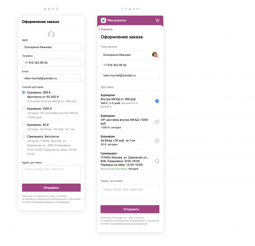 Мы сделали форму заказа более информативной: до кнопки заказа меньше листать, а описание доставки теперь лучше видно за счёт крупного черного шрифта. А если у пользователя есть аккаунт на Яндексе и он авторизован, данные автоматически заполнят необходимые для заказа поля, чтобы процесс покупки был ещё более быстрым.