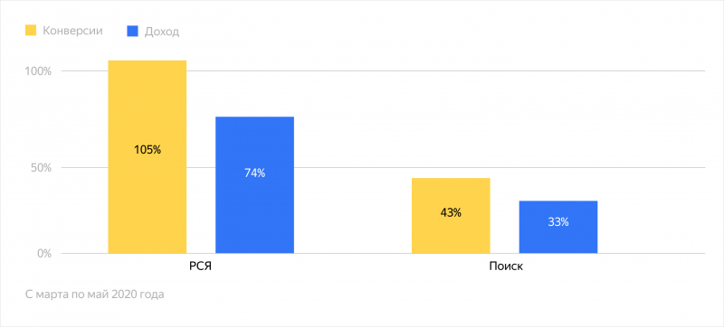 Автостратегия «Оптимизация конверсий» с оплатой за совершённые конверсии принесла в среднем в два раза больше конверсий в неделю в РСЯ и на 43% больше на поиске.Доход вырос на 33% на поиске и на 74% в РСЯ.Средний показатель ДРР (доля рекламных расходов) по кампаниям снизился на 4% на поиске и на 56% в РСЯ.