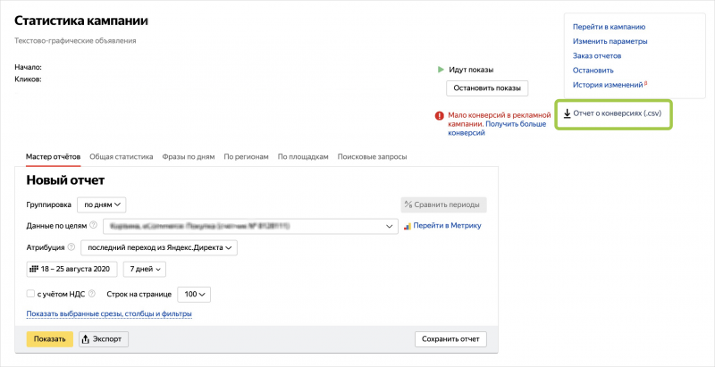Вариант для тех, кому подсказок будет недостаточно: если вы ещё не представляете, сколько стоит выполнение нужной цели, для начала запустите «Оптимизацию конверсий» с ограничением недельного бюджета, но не устанавливайте цену конверсии. За две недели алгоритм найдёт конверсии и соберёт статистику, на основе которой можно будет определить цену для настройки. Если цена конверсии выше ожидаемой, то стоит поработать с таргетингами, креативами и конверсионностью посадочной страницы. Следить за конверсиями поможет отдельный отчёт:
