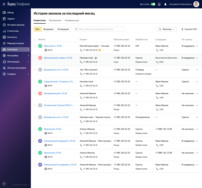Помимо поддержки наиболее востребованных функций виртуальной АТС, Яндекс.Телефония позволяет строить графы маршрутизации звонков и объединять статистику по компании и каждому отдельному сотруднику в мобильном приложении.