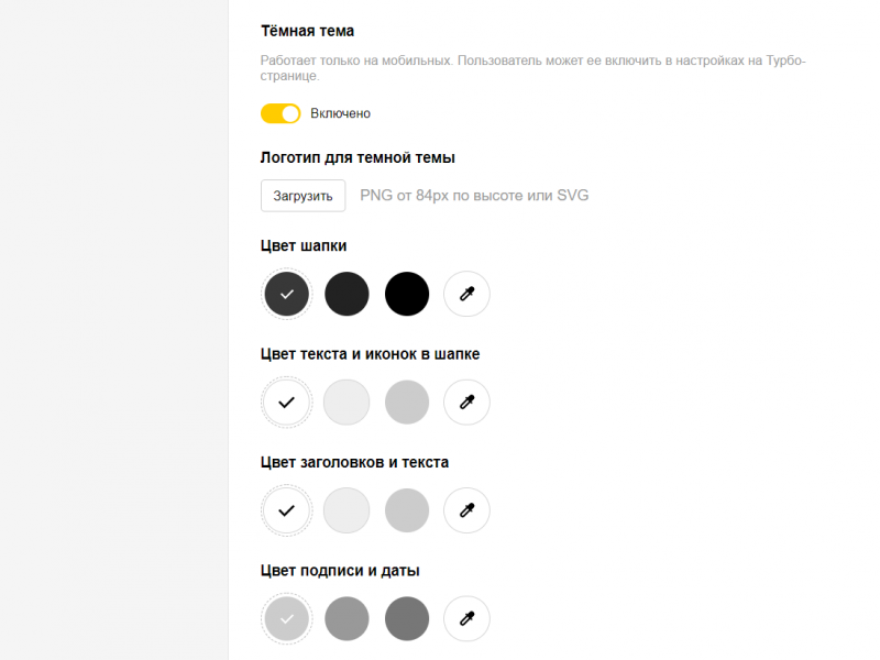 Кроме того, в подразделе «Цвета» появилась возможность включать и отключать на сайте тёмную тему. Для того, чтобы включить тему, в блоке Тёмная тема переведите переключатель в состояние Включено. Также настройте цвета и загрузите её логотип.