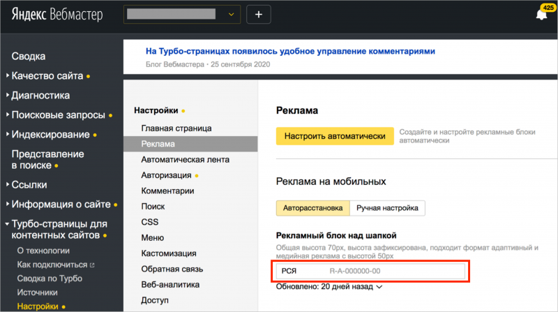 Отключите ручные настройки рекламы, удалив в RSS рекламные теги вида:В интерфейсе Вебамастера перейдите в раздел «Настройки» — «Реклама». Выберите поле «Авторасстановка» и перенесите туда ID блоков.