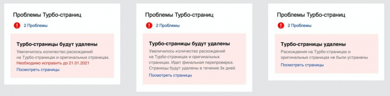Предупреждает о снижении качества Турбо-страниц и наличии ошибок, которые нужно исправить. Если количество ошибок вырастет и они будут заметны пользователям, Турбо-страницы пропадут из поиска. Когда ошибки исправлены, нужно нажать кнопку «Проверить».