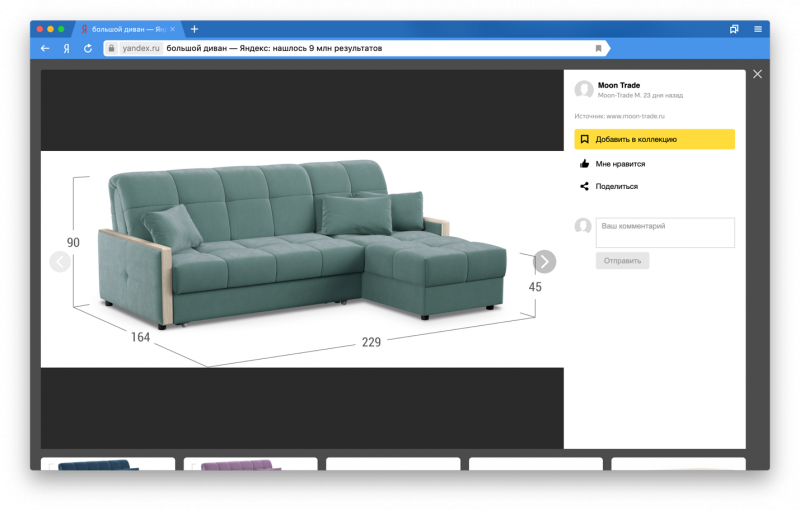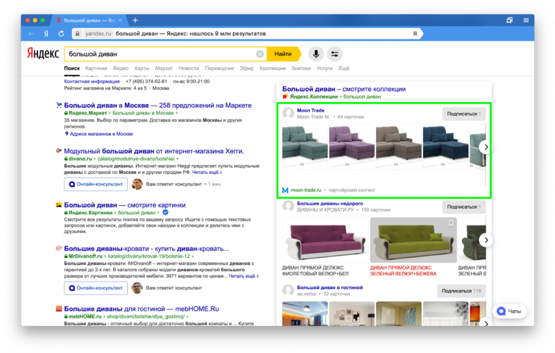 Мы знаем, что многие бизнесы активно вкладываются в качественные фото своих товаров и услуг, и уверены, — Коллекции станут отличным источником дополнительной аудитории для вашего бренда.Новый тип кампаний «Продвижение контента» в Яндекс.Директе позволит в показывать вашу подборку в приоритетном размещении по релевантным запросам. Вот так: