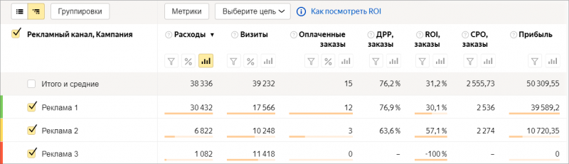 Помимо этого, отчет поможет быстро найти причину низкой окупаемости рекламы. Например, сравнить стоимость клика (CPC, cost per click), конверсии на сайте (CPA, cost per action) и финальной продажи (CPO, cost per order). Если у какого-то канала на общем фоне аномальный CPC, а остальные метрики не сильно отличаются от других источников, стоит уделить внимание настройкам рекламного кабинета.