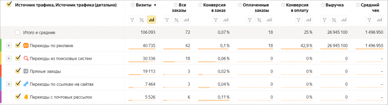 Сравните «Конверсию в заказ» с «Конверсией в покупку» — это поможет понять, с каким этапом воронки стоит поработать в первую очередь. Если по всем источникам конверсия в заказ стабильно низкая, возможно, дело в сайте — и стоит сделать кнопку «Оформить заказ» заметнее или по-другому поработать над его удобством. А если конверсия в заказ в порядке, но проседает конверсия в оплату — а заявки при этом обрабатываются вручную — это повод подумать, как улучшить работу отдела продаж.Посмотрите, отличается ли средний чек в зависимости от канала. Если да, возможно, что в каналах с низким чеком нужно скорректировать настройки кампаний, чтобы привлекать более платежеспособную аудиторию.