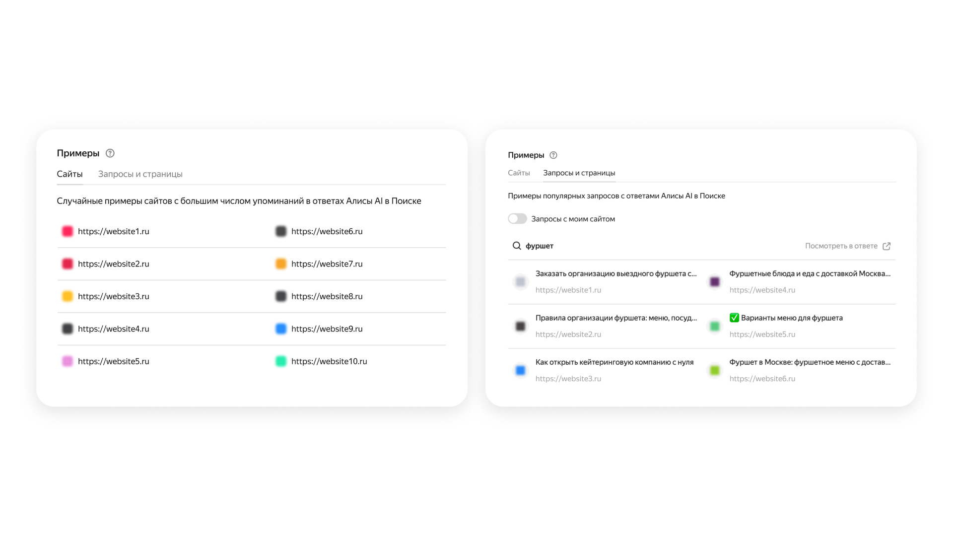 доля упоминаний сайта среди источников, которые Алиса AI использует для формирования ответов;динамика доли запросов с упоминаниями вашего сайта с разбивкой по месяцам;примеры запросов, по которым ваш сайт фигурирует в ответах Алисы;сайты в вашей тематике — вы увидите, какие ресурсы чаще всего упоминаются в генеративной выдаче.Как пользоваться инструментом?