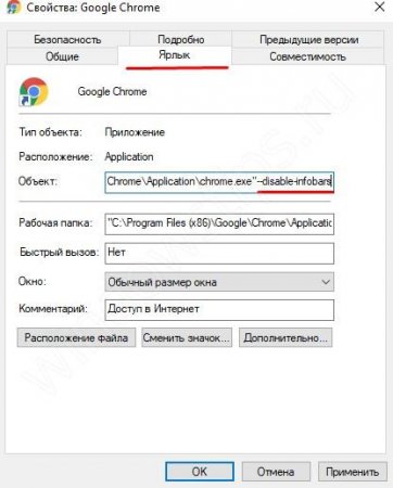 Проверьте, что итоговая надпись имеет приблизительно следующий вид — C:Program FilesGoogleChromeApplicationchrome.exe --disable-infobars. Будьте внимательны с символами. Перед последней фразой ставится не два тире, а пара дефисов.