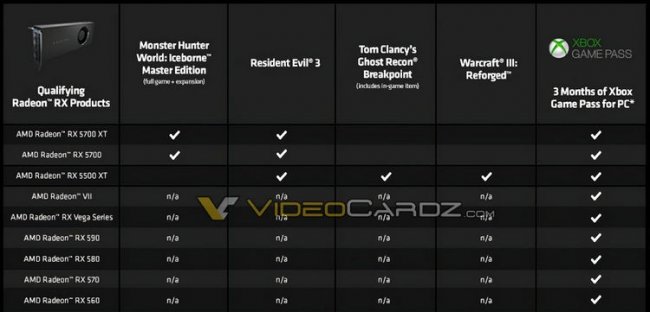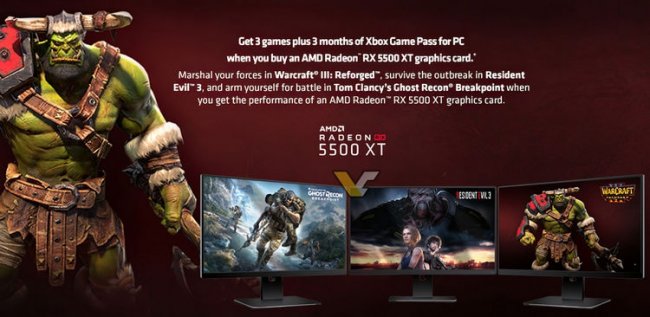 Компания AMD регулярно вместе со своими видеокартами предоставляет потребителям бесплатные игры, причём довольно известные и популярные. Последняя подобная акция Raise The Game 2019 завершилась 31 декабря минувшего года, и теперь AMD готовит новую Raise The Game 2020, сообщает ресурс VideoCardz. В отличие от прошлой акции, теперь бесплатные игры получат только покупатели новых видеокарт Radeon RX 5000-й серии. Вместе с видеокартой Radeon RX 5500 XT будет предоставляться сразу три игры бесплатно: Resident Evil 3, Tom’s Clancy’s Ghost Recon Breakpoint и Warcraft III: Reforged. В свою очередь покупателям Radeon RX 5700 и RX 5700 XT достанется только две игры: Resident Evil 3 и Monster Hunter World: Iceborne Master Edition. Подчёркивается, что случае с последней пользователи получат полную игру со всеми дополнениями. Ещё вместе со всеми видеокартами Radeon RX 500-й и RX 5000-й серии, а также Radeon VII будет бесплатно предоставляться доступ к Xbox Game Pass для ПК на три месяца. Заметим также, что по какой-то причине видеокарта Radeon RX 5600 XT отсутствует в опубликованном списке, но, возможно, перед нами просто не финальная версия списка, сделанная ещё до выхода RX 5600 XT. Сообщается, что акция стартует 4 февраля и продлится до 25 апреля, а игры активировать можно будет до 25 мая.