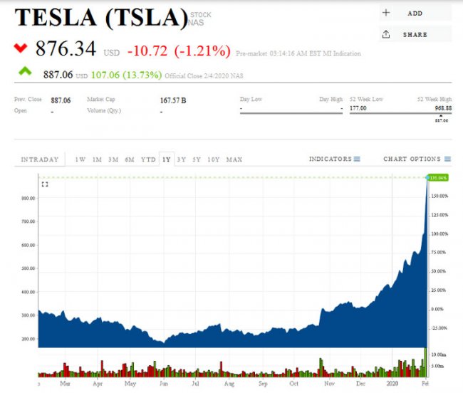 Во вторник акции Tesla продолжили своё ралли. Если в понедельник акции компании выросли почти на 20 %, то во вторник суточный подъём составил 24 %, и только благодаря специальному снижению перед завершением торгов на $100 прежний рекорд не был побит. Тем самым за прошедшие сутки акции компании выросли на 14 % и стали стоить $878.
