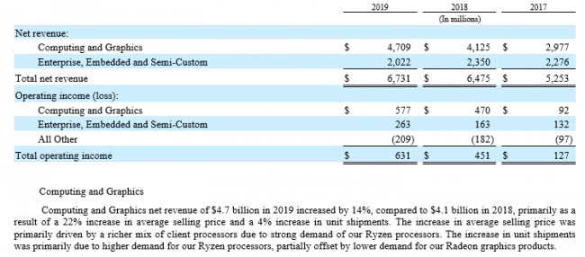 Прошлый год принёс AMD увеличение выручки от реализации центральных процессоров и графических решений на 14 %. Компания склонна благодарить за это возросшую популярность как процессоров Ryzen в целом, так и наиболее дорогих моделей этого семейства. Среднюю цену реализации продукции в этом сегменте удалось поднять на 22 % по сравнению с 2018 годом.