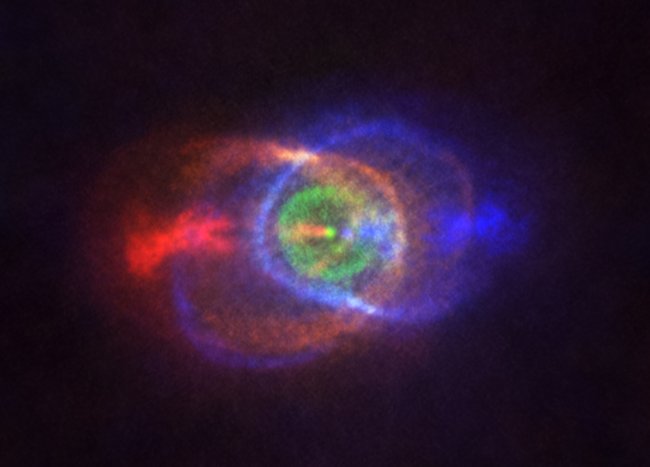 Европейская южная обсерватория (European Southern Observatory, ESO) представила прекрасное изображение звёздной системы HD101584, которая находится на расстоянии от 1800 до 5900 световых лет от нас в созвездии Центавра. Информация сайта - «dima-gid.ru» Наблюдения проводились с использованием Большой Атакамской миллиметровой / субмиллиметровой антенной решётки ALMA. Кроме того, был задействован телескоп ESO APEX (Atacama Pathfinder Experiment). Объект HD101584 — это система из двух светил, активно взаимодействующих друг с другом. Одна из звёзд увеличилась в размерах до такой степени, что начала поглощать вторую, которая, в свою очередь, устремилась по сходящейся спирали к своему компаньону, срывая его внешние оболочки. По сути, исследователи запечатлели эффектный финал «звёздного поединка». Когда главная звезда системы раздулась и превратилась в красного гиганта, она поглотила своего маломассивного соседа. Информация сайта - «dima-gid.ru» На снимке показано газовое облако. Разными цветами обозначены скорости вещества — от голубого (газ, движущийся с самой большой скоростью к нам) до красного (газ, движущийся с самой большой скоростью от нас). «Обе звезды двойной системы заключены в пределах яркой точки в центре кольцеобразной структуры, показанной зелёным, которая движется вдоль луча зрения с той же скоростью, что и вся система», — отмечает ESO.