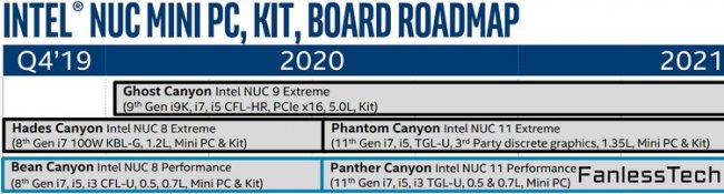 В минувшем январе мы писали о том, что компания Intel готовит новые компактные настольные компьютеры NUC 11 на процессорах Tiger Lake. И теперь, благодаря ресурсу FanlessTech стало известно, когда именно стоит ждать появления этих систем, а также и самих процессоров нового поколения. раздобыл и опубликовал фрагмент так называемой «дорожной карты» компании Intel, посвящённой компактным системам NUC. Согласно представленному документу, новые компактные настольные компьютеры NUC 11 на процессорах Tiger Lake-U станут доступны в течение второй половины текущего 2020 года. Однако надо осознавать, что в планы Intel, как и многих других технологических компаний, может вмешаться коронавирус, поэтому выход процессоров нового поколения может задержаться. На данный момент мы с уверенностью можем сказать лишь, что компьютеры NUC 11 на процессорах Tiger Lake-U выйдут не раньше третьего квартала. Примерно в одно время с новыми мини-ПК, а возможно и несколько раньше, начнут появляться и ноутбуки на процессорах Tiger Lake-U. Всё это значит, что до анонса мобильных чипов Core 11-го поколения осталось не так уж много времени. Возвращаясь к самим мини-ПК следующего поколения, отметим, что в планы Intel входит выпуск двух семейств компьютеров NUC 11 с кодовыми названиями Panther Canyon и Phantom Canyon. Системы Panther Canyon являются классическими NUC квадратной формы (на первом изображении) и будут построены на процессорах Core i3, Core i5 и Core i7 поколения Tiger Lake-U со встроенной графикой 11-го поколения. В свою очередь в семействе Panther Canyon будут представлены более крупные и более производительные модели NUC 11 Extreme. Здесь тоже будут использоваться чипы Tiger Lake-U серий Core i5 и Core i7, но при этом их дополнит дискретная графика «от стороннего производителя». Эти компактные компьютеры будут позиционироваться в качестве игровых мини-ПК.