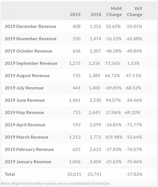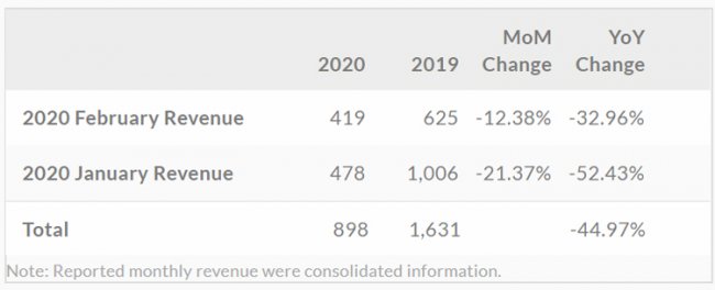 Так, выручка за минувший месяц составила NT$419 млн, или примерно $14 млн. Это новый антирекорд. Для сравнения: годом ранее компания получила NT$625, или $21 млн дохода. Таким образом, в годовом исчислении выручка рухнула на треть.
