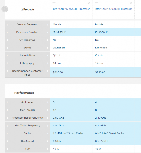 Среди новинок числятся процессоры Core i7-9750HF и Core i5-9300HF. Первый предлагает шесть ядер и двенадцать потоков с частотами от 2,6 ГГц до 4,5 ГГц, второй — четыре ядра и восемь потоков с частотами от 2,4 ГГц до 4,1 ГГц. Старший процессор оснащён 12 Мбайт кеша третьего уровня, младший — 8 Мбайт кеша третьего уровня. Предел TDP не превышает 45 Вт, его можно снизить до 35 Вт за счёт ограничения тактовых частот. Примечательно, что стоимость лишённых графики процессоров не отличается от стоимости процессоров родственных моделей с полноценно функционирующей графикой.
