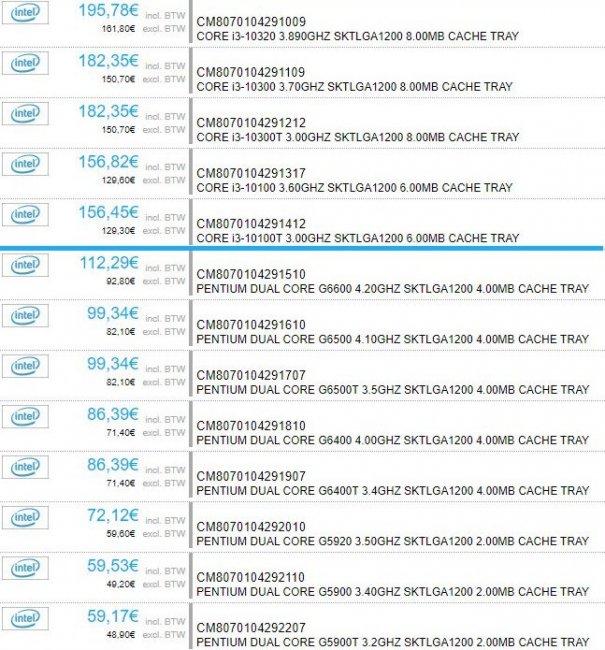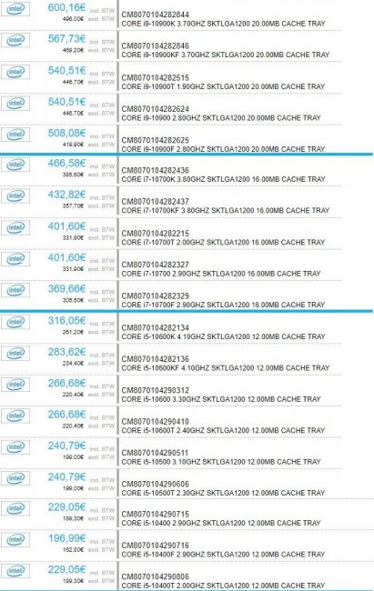 Компания Intel уже довольно долго готовит настольные процессоры нового поколения, также известные под названием Comet Lake-S. Недавно мы узнали, что процессоры Core десятого поколения должны выйти когда-то во втором квартале, а сегодня благодаря известному сетевому источнику с псевдонимом momomo_us стали известны цены почти всех будущих новинок. Грядущие процессоры Intel появились в ассортименте некоего нидерландского интернет-магазина, причём здесь упоминаются почти все модели: от младших двухъядерных Pentium до флагманских десятиядерных Core i9. Даже модели T-серии с пониженным энергопотреблением есть, не хватает разве что самых младших Celeron. Как водится во многих европейских магазинах, для каждой модели Comet Lake-S здесь указано две цены — с налогом на добавленную стоимость (НДС), который в Голландии равен 21 %, и без него. Нам неизвестно, указаны ли здесь рекомендованные розничные цены или же продавец добавил что-то от себя. Как бы то ни было, для флагманского Core i9-10900K указана цена в 496 евро без НДС, а потребителю, то есть с налогом, он обойдётся в 600 евро с небольшим. Для сравнения, актуальный флагманский Core i9-9900K в Голландии стоит от 550 евро, включая НДС. Предсказать на основе этих данных российские цены довольно сложно, потому как Intel для России устанавливает цены ниже европейских, но ближе к американским. И на данный момент с уверенностью можно сказать лишь то, что цены в России вряд ли будут ниже указанных выше европейских цен без НДС. А с учётом складывающейся ситуации с обменным курсом, ситуация рисуется не самая радужная.