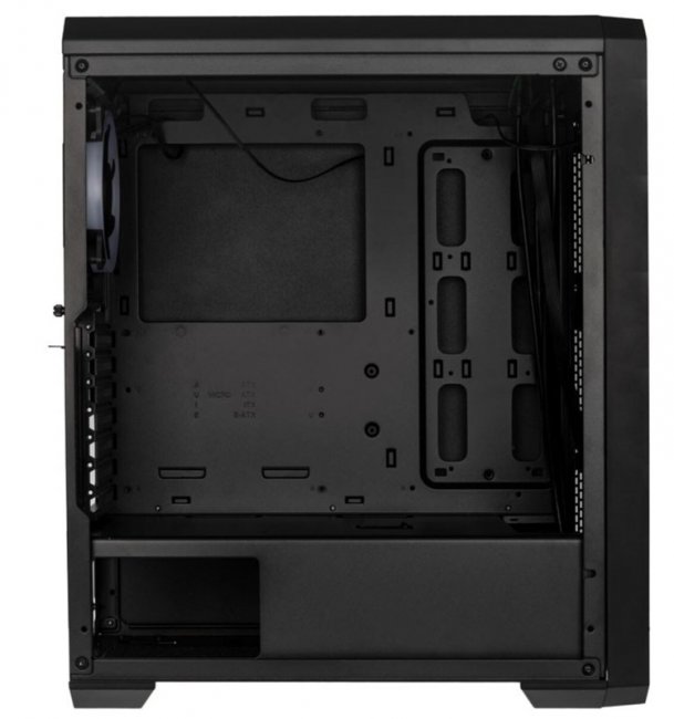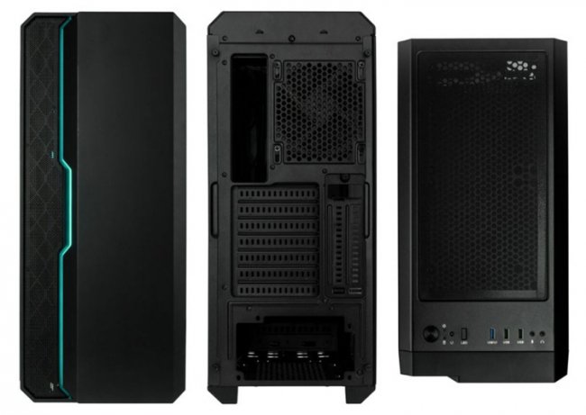 Фронтальная часть разделена на две секции, одна из которых имеет сетчатое исполнение. Здесь предусмотрена многоцветная адресуемая подсветка RGB в виде ломаной линии. В задней части изначально смонтирован 120-мм вентилятор с подсветкой.