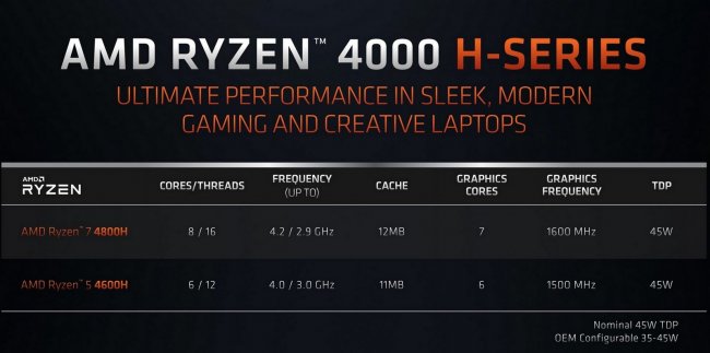 В целом, новые однокристальные системы потребляют на 20 % меньше энергии и выполняют на 15 % больше инструкций за такт. Новые продукты представлены в двух сериях: Ryzen 4000U для тонких ноутбуков и Ryzen 4000H для игровых и творческих решений. Первые отличаются более низкими базовыми частотами и энергопотреблением не выше 15 Вт, тогда как у более производительной серии TDP составляет 45 Вт. Компания также готовит серию Pro для профессиональных и тонких компьютеров.