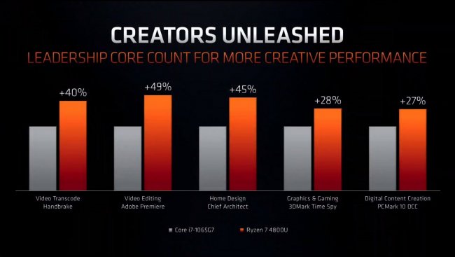 AMD отмечает, что её новые решения уравнялись с конкурентными предложениями от Intel в производительности однопоточных вычислений и заметно превосходят в многопоточном режиме и графических нагрузках. По уровню производительности Ryzen 7 4800H на 33,6 % обходит аналогичный 16-поточный Intel Core i9-9880H с энергопотреблением 45 Вт.