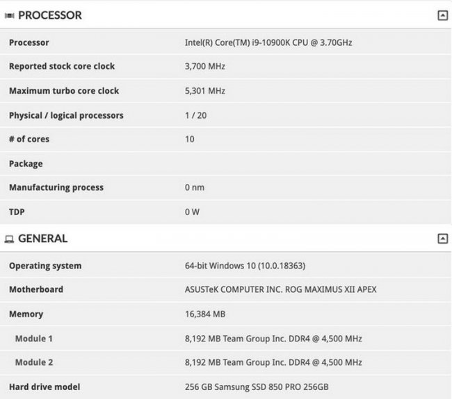 Несмотря на то, что разговоры о новых настольных процессорах Comet Lake-S ведутся уже довольно давно, до сих пор точно неизвестно, когда Intel представит их официально. Тем не менее, многое о них мы знаем из множества слухов и утечек, и сегодня появилось ещё одно подтверждение характеристик будущего флагмана — Core i9-10900K. Известный источник, скрывающийся за псевдонимом _rogame, обнаружил в базе данных бенчмарка 3DMark очередную запись о тестировании системы с флагманским Core i9-10900K. Данный процессор, как уже давно известно, обладает десятью ядрами и двадцатью потоками. Согласно тесту, его базовая тактовая частота составляет 3,7 ГГц (это совпадает с прежними данными), тогда как максимальная частота динамического разгона достигает 5,3 ГГц. Интересно, что прежде тесты 3DMark определяли для Core i9-10900K максимальную частоту в 5,1 ГГц. Ранее предполагалось, что такая частота достигается при использовании технологии Turbo Boost. В свою очередь частота 5,3 ГГц упоминалось лишь в утечках спецификаций всех процессоров, но не в результатах тестов — с ней процессор должен работать, когда задействует технологию Thermal Velocity Boost (TVB). Но в данном случае процессор, вероятно, тестировался с более мощной системой охлаждения и мог самостоятельно развить более высокую предельную частоту. В конце отметим, что процессор тестировался на материнской плате ASUS ROG Maximus XII Apex, которая по всей видимости построена на флагманской системной логике Intel Z490. Обычно модели Apex занимают среднюю позицию в серии Maximus и имеют упор на экстремальный разгон, хотя в целом любая из плат Maximus является очень продвинутой платой верхнего ценового сегмента. Кстати, в протестированной системе оперативная память работала за пределами номинального режима — с частотой 4500 МГц.