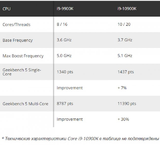 Ожидается, что процессор i9-10900K станет преемником i9-9900K, от которого он будет отличаться двумя дополнительными ядрами и слегка повышенными частотами. В то время как Core i9-9900K имеет базовую тактовую частоту 3,6 ГГц, которая может повышаться до 5,0 ГГц с помощью технологии Turbo Boost, для нового чипа эти частоты составят 3,7 и 5,1 ГГц соответственно.