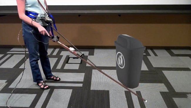 Microsoft Research выпустила ещё одно видео с ранее уже демонстрировавшейся продвинутой тростью с тактильной отдачей, которая позволяет ориентироваться в виртуальной реальности людям с нарушениями зрения. Контроллер имитирует настоящую трость, которой пользуются слепые, поэтому он подходит для большого числа слабовидящих, уже обученных обращению с тростью. Устройство открывает для людей с проблемами зрения вход в виртуальное пространство: оно способно моделировать навигацию в больших виртуальных средах со сложной архитектурой, такой как извилистые дорожки, а также пространства с перегородками и дверьми. Контроллер трости использует лёгкий трёхосный механизм тормоза, который останавливает трость при соприкосновении с виртуальными объектами, позволяя передавать их масштаб и форму. Несколько степеней свободы позволяют пользователю адаптировать контроллер к своим предпочтениям и хвату. Кроме того, текстуры поверхности передаются посредством виброотклика, который различается для разного типа поверхностей. Помогает навигации и пространственный звук, вычисляемый на основе движения звуковых волн в виртуальном пространстве и передаваемый на наушники пользователя. Microsoft Research проверила удобство использования трости с помощью игры, посвящённой поиску мусора. Семь из восьми пользователей смогли успешно перемещаться по виртуальной комнате (6 ? 6 м), верно определяя объекты и избегая столкновений. Microsoft отметила, что созданный инструмент также можно использовать для обучения пользователей с нарушениями зрения в безопасной виртуальной среде перед тем, как они будут оттачивать свои навыки уже в реальном мире. Microsoft разрабатывает и другие необычные контроллеры для виртуальной реальности, а также выпустила приложение, которое помогает слепым перемещаться по улицам города.