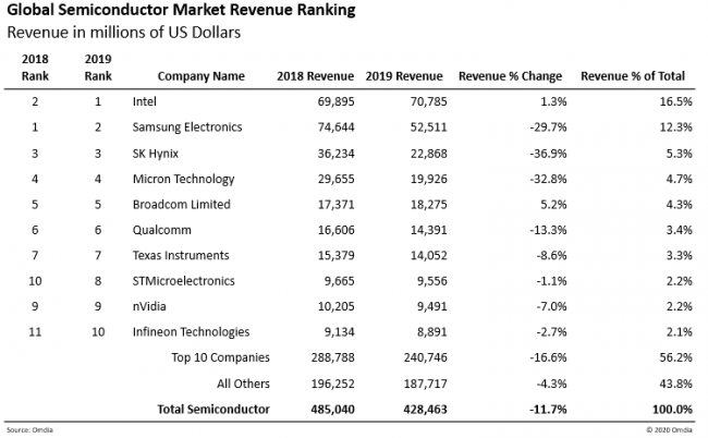 Аналитическое агентство Omdia, ранее известное как IHS Markit, опубликовало рейтинг крупнейших поставщиков полупроводниковой продукции с точки зрения выручки. По сравнению с 2018 годом, по итогам прошлого компании Intel удалось вернуть себе статус лидера, оттеснив Samsung Electronics на второе место. Выручка отрасли в целом сократилась в 2019 году на 11,7 %, что делает достижение Intel ещё более значимым. Кстати, в первой десятке игроков есть ещё одна компания с положительной динамикой выручки — это Broadcom с приростом на 5,2 %, которой удалось сохранить пятое место в рейтинге.