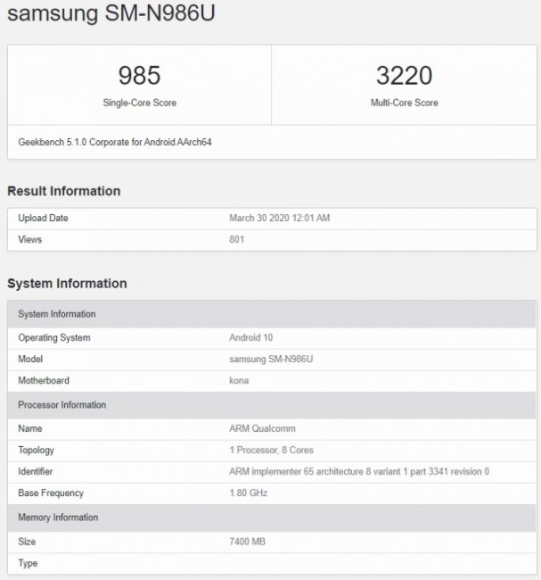 В базе Geekbench упоминается модель SM-N986U, которая, как ожидается, выйдет на рынок под именем Galaxy Note 20+. Это предположение основано на том, что Galaxy Note 10+ до запуска числился под кодовым именем SM-976U. Протестированное устройство оснащено восьмиядерным чипом, который обозначен кодовым именем «kona» (под ним же известен Snapdragon 865). Однако тактовая частота данной однокристальной платформы оказалась выше, чем у базовой модели (3,09 против 2,84 ГГц). Это может означать, что перед нами Snapdragon 865 Plus.