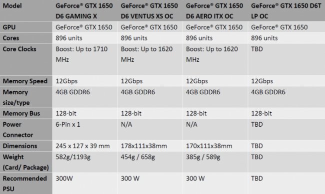 MSI представила четыре видеокарты: MSI GeForce GTX 1650 D6 Gaming X, GTX 1650 D6 VENTUS XS, GTX 1650 D6 AERO ITX и низкопрофильную GTX 1650 D6 LP, каждая из которых также доступна в разогнанном варианте.