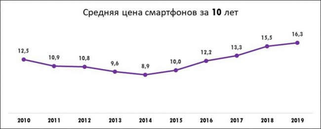 «При этом, несмотря на огромные технические изменения, средняя стоимость смартфона выросла всего на 31 %: c 12,5 тыс. рублей в 2010 году до 16,9 тыс. рублей в 2019 году», — отмечает «Связной».