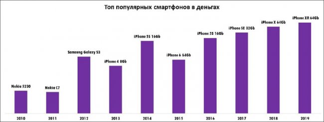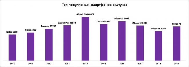 В 2010 году на смартфоны приходилось только 10 % в общем объёме рынка сотовых аппаратов (включая обычные мобильные телефоны). В 2019-м этот показатель составлял уже 80 %.
