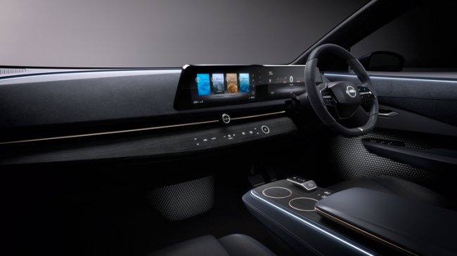 Электромобиль-кроссовер Ariya оборудован изогнутой панелью с двумя экранами, напоминающей по форме волну. Утверждается, что горизонтальная компоновка дисплея позволяет передавать информацию так, что она лучше воспринимается человеческим глазом. Кроме того, информация выводится в безопасную зону, которая находится на линии прямого взгляда водителя, ближе к дороге.