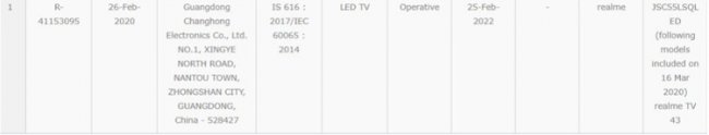 Китайская компания Realme, известный разработчик смартфонов, постепенно осваивает новые сегменты потребительской электроники: одним из направлений станут «умные» телевизоры. Ранее о планах Realme по выходу на рынок смарт-ТВ рассказал директор по маркетингу компании (CMO) Фрэнсис Ван (Francis Wang). Ожидается, что такие панели дебютируют в текущем квартале. Как теперь сообщают сетевые источники, один из будущих телевизоров показался в документации на сайте Бюро индийских стандартов (Burea of Indian Standards, BIS). Модель фигурирует под кодовым обозначением JSC55LSQL. Отмечается, что панель имеет размер 43 дюйма по диагонали. Информации о разрешении и других характеристиках на данный момент, увы, нет. Очевидно, что Realme выпустит смарт-телевизоры и в других вариантах размера. Скорее всего, будут представлены модели форматов Full HD (1920 ? 1080 пикселей) и 4К (3840 ? 2160 точек). Добавим, что Realme в скором времени также намерена анонсировать свои первые наручные смарт-часы.