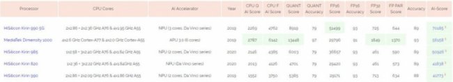 В опубликованном сегодня посте в Weibo вице-президент Honor поделился результатами бенчмарка, тестирующего возможности процессоров при работе с искусственным интеллектом. В опубликованном рейтинге Kirin 985 занял третье место, уступив только Kirin 990 и MediaTek Dimensity 1000, расположившимся на первом и втором местах соответственно. Флагманский чип Qualcomm Snapdragon 865 занял 8 место в рейтинге.