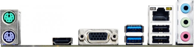 На интерфейсной панели можно обнаружить гнёзда PS/2 для клавиатуры и мыши, разъёмы HDMI и D-Sub для подключения дисплеев, по два порта USB 3.2 Gen1 и USB 2.0, гнездо для сетевого кабеля и набор аудиогнёзд. Габариты платы — 170 ? 170 мм.
