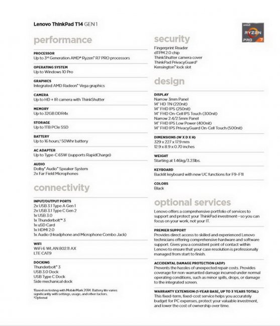 Компания Lenovo в феврале этого года анонсировала новые ноутбуки ThinkPad на базе процессоров AMD Ryzen 4000: ThinkPad T14, ThinkPad T14s и ThinkPad X13. Тогда большой новостью для многих стало упоминание в технических характеристиках каждой из новинок порта Thunderbolt 3. Но с приближением начала продаж выяснилось, что данный порт в ноутбуках отсутствует. Поддержка Thunderbolt всегда являлась одним из важных преимуществ ноутбуков, работающих на базе процессоров Intel. Например, через Thunderbolt можно подключить внешнюю видеокарту, что позволит существенно «прокачать» графическую систему. Но поскольку стандарт был разработан компанией Intel, то в ноутбуках на базе процессоров AMD этого порта не было. Указание порта на новых моделях ThinkPad на базе AMD Ryzen 4000 стало настоящим откровением. Но, как выяснили коллеги с портала Notebook Check, изначально представленные прессе в феврале технические характеристики ноутбуков ThinkPad на базе AMD Ryzen 4000 содержали сразу несколько ошибок. Информация сайта - «dima-gid.ru» Журналисты смогли найти на просторах Сети обновленную техническую информацию для моделей T14 и T14s. Во-первых, выяснилось, что в обновленных данных не значатся порты Thunderbolt 3 для этих моделей. Помимо этого, у модели T14 отсутствует сетевой порт RJ45, который также присутствовал в изначально представленных в феврале технических данных. Информация сайта - «dima-gid.ru» Другими словами, Lenovo изначально сообщила прессе неправильные спецификации своих устройств. Обращение в Lenovo подтвердило это предположение. К слову, прочие представленные к настоящему моменту ноутбуки на базе процессоров AMD Ryzen 4000 от других производителей также не заявляют наличие портов Thunderbolt 3. Речь идёт, например, о таких моделях, как Acer Swift 3 и Aspire 5, ROG Zephyrus G14 и TUF Gaming A15 от ASUS, G5 15 Special Edition от Dell и Bravo 15 от MSI.