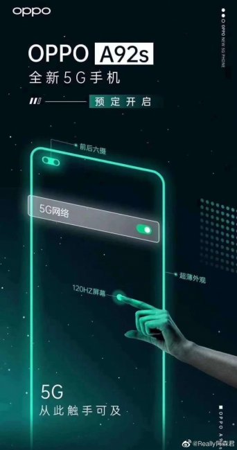 Судя по постерам, смартфон OPPO A92s оснащён 6,57-дюймовым ЖК-дисплеем с частотой обновления 120 Гц. Устройство основано на чипе Dimensity 800, и имеет на борту по меньшей мере 8 Гбайт оперативной памяти и флеш-накопитель UFS 2.1 ёмкостью 128 Гбайт.